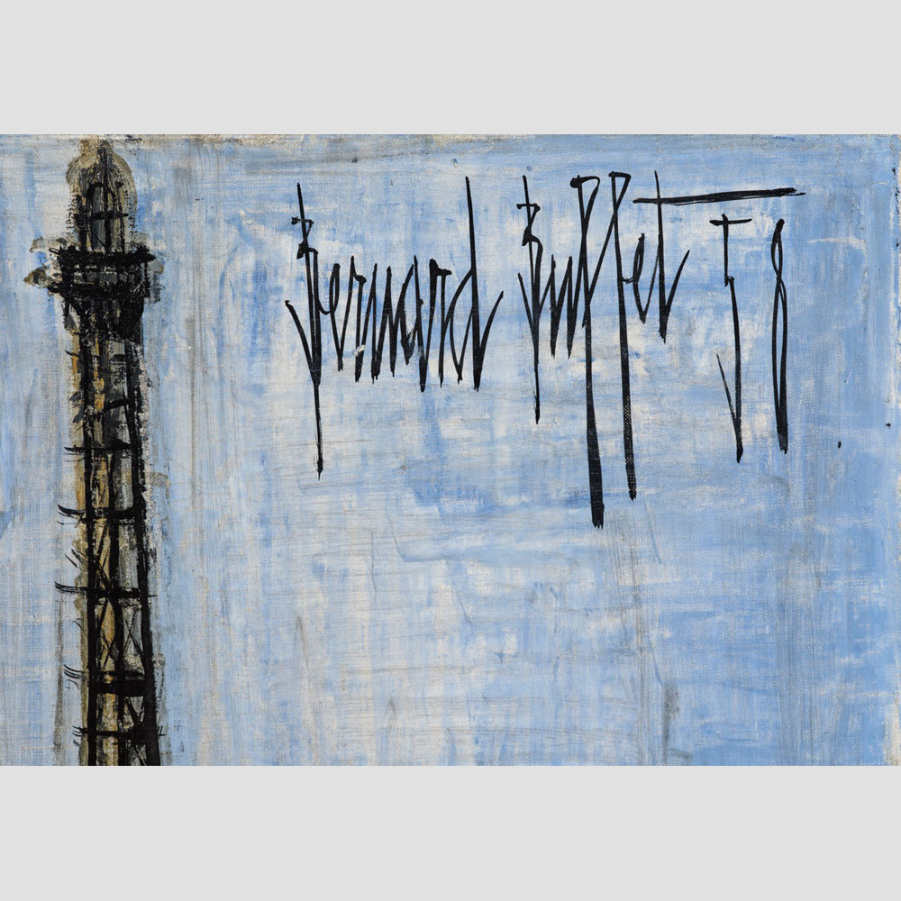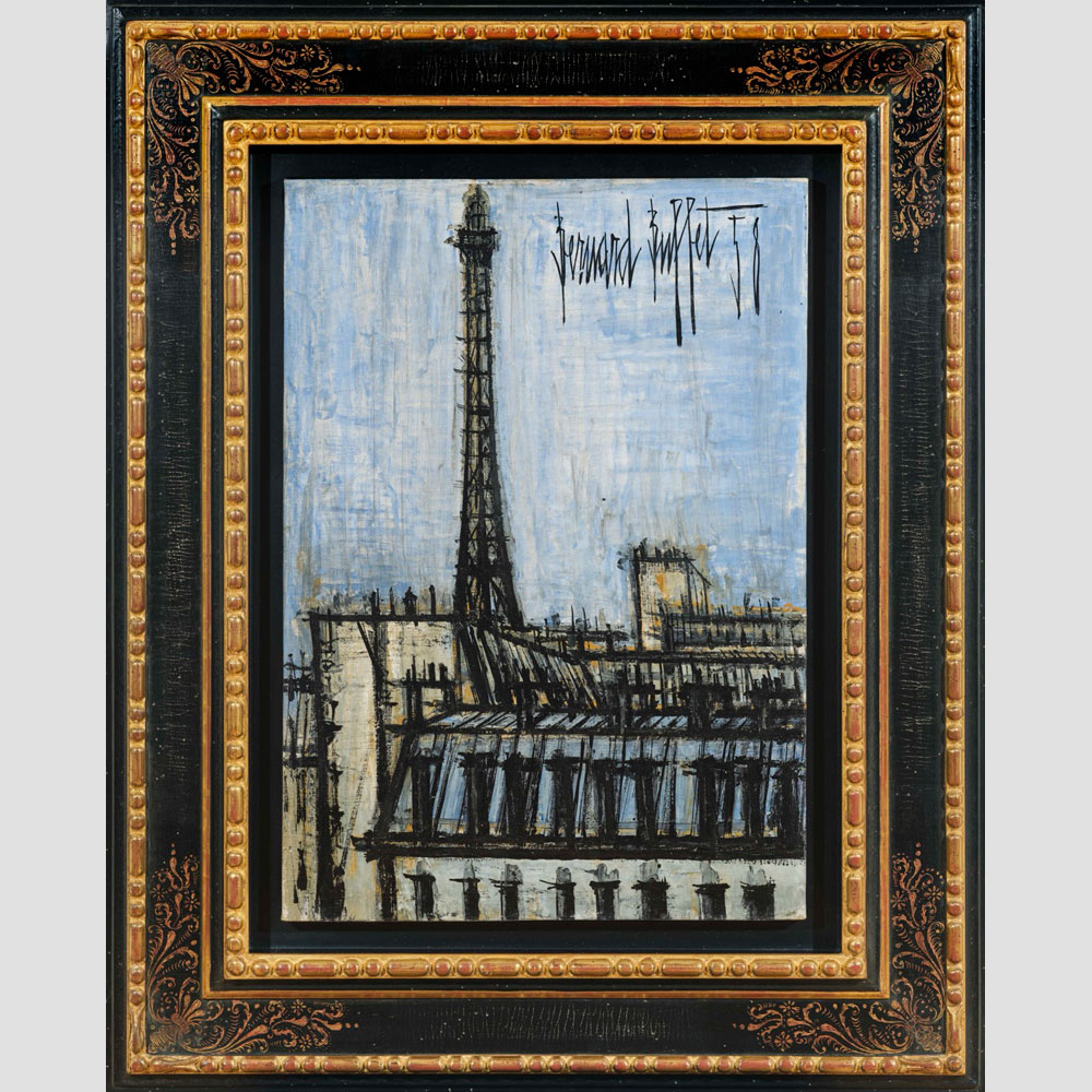 Ce tableau de 1958 de Bernard Buffet représente la Tour Eiffel, emblème de Paris, vue depuis les toits de la capitale. Fidèle à son style, l’artiste construit la composition à partir de lignes noires épaisses qui structurent l’espace et accentuent la verticalité du monument. Le ciel bleu, strié de touches grises, confère à l’ensemble une atmosphère froide et mélancolique. Les toits parisiens, rendus par des aplats sombres et anguleux, évoquent une ville figée, silencieuse. Buffet ne cherche pas à peindre un Paris lumineux ou romantique, mais un paysage urbain austère et presque déserté. La Tour Eiffel, dressée comme un signe graphique, domine la ville avec une majesté sévère. À travers cette vision, l’artiste transforme le symbole de modernité en image de solitude et de rigueur, typique de son univers expressionniste.