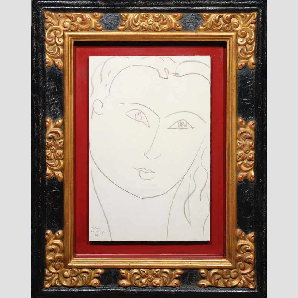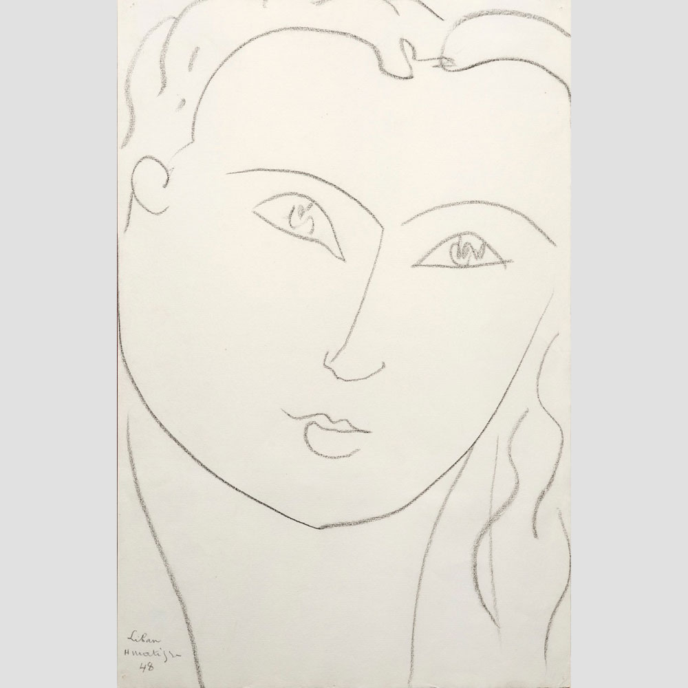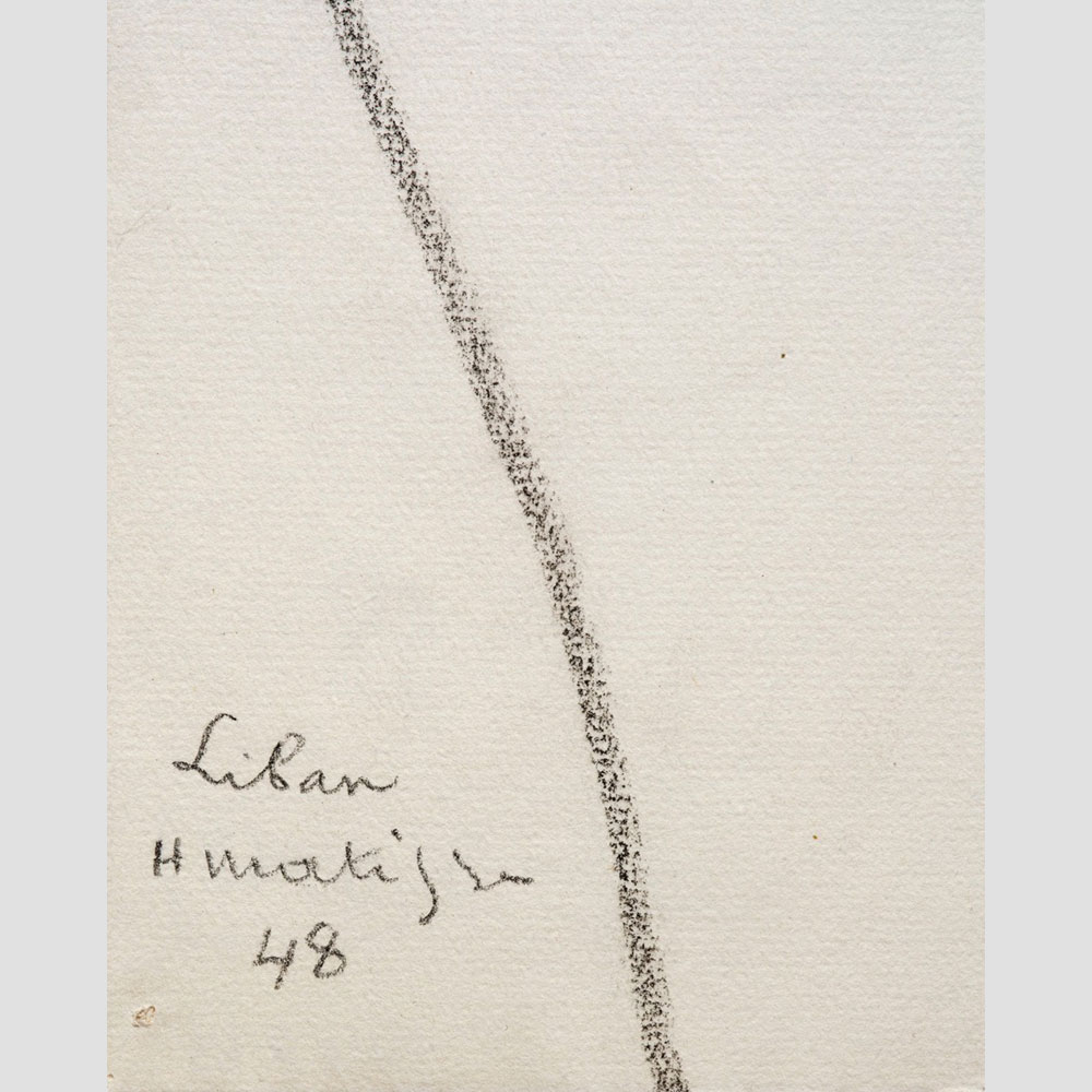 Created in 1948, this drawing by Henri Matisse depicts the portrait of a woman, rendered in pencil with great delicacy. The face, both stylized and expressive, is defined by supple, confident lines that outline the essential features: almond-shaped eyes, a refined nose, softly traced lips, and a flowing lock of hair. The inscription “Liban” in the lower left suggests that the model may have been of Lebanese origin, or that the work refers to a memory or encounter connected to that country. The drawing demonstrates Matisse’s mastery of line—each mark, though seemingly simple, contributes to a subtle balance of form and grace. Through this restrained approach, the artist conveys a vivid sense of presence and gentle emotion. With its elegant clarity and refined composition, this portrait recalls certain graphic explorations by Picasso or Modigliani, while remaining distinctly Matisse — an art of the line that is at once free, precise, and profoundly harmonious.