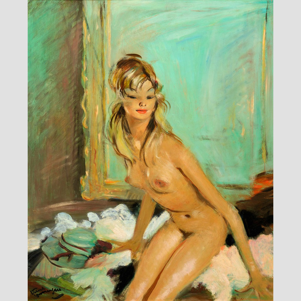 Jean-Gabriel Domergue was born in Bordeaux, France on March 4th, 1889. An extremely talented and precocious painter, Domergue exhibited works at the Salon Des Artistes Français (the French Artists Exhibition) in 1906 at the young age of seventeen. In 1913, he was awarded the Second Prize of Rome and went on to win the gold medal award in the 1920 show. He then began showing outside the exhibition. Having first been recognized for his landscapes which he painted with great ease, his career took a decisive turn during the 1920’s. At this time he became the painter of the « Parisian lady ». Domergue invented a new type of woman : thin, airy, elegant, with a swanlike neck and wide seductive eyes which gaze upon the world with longing. “I invented the pin-up » he later claimed. He went on to paint approximately 3,000 portraits. Even though Domergue painted numerous nudes using fashionable actresses or young dancers as his models, he was nevertheless, highly prized in the aristocratic and high society circles painting individuals such as Liane de Pougy or Nadine, the future Baroness of Rothschild. Domergue was also one the main organizers for famous Parisian gala events such as « The Venetian Ball »
